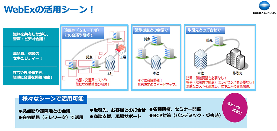 「WebEX」を使えば、社内はもちろん在宅勤務、外出先からでも、PC・スマートフォン・タブレット端末などからWeb会議に参加できます。デスクトップ共有などの様々な共有機能と音声会議・ビデオ機能を利用し、さまざまなシーンで効率的なコラボレーションを実現します。
