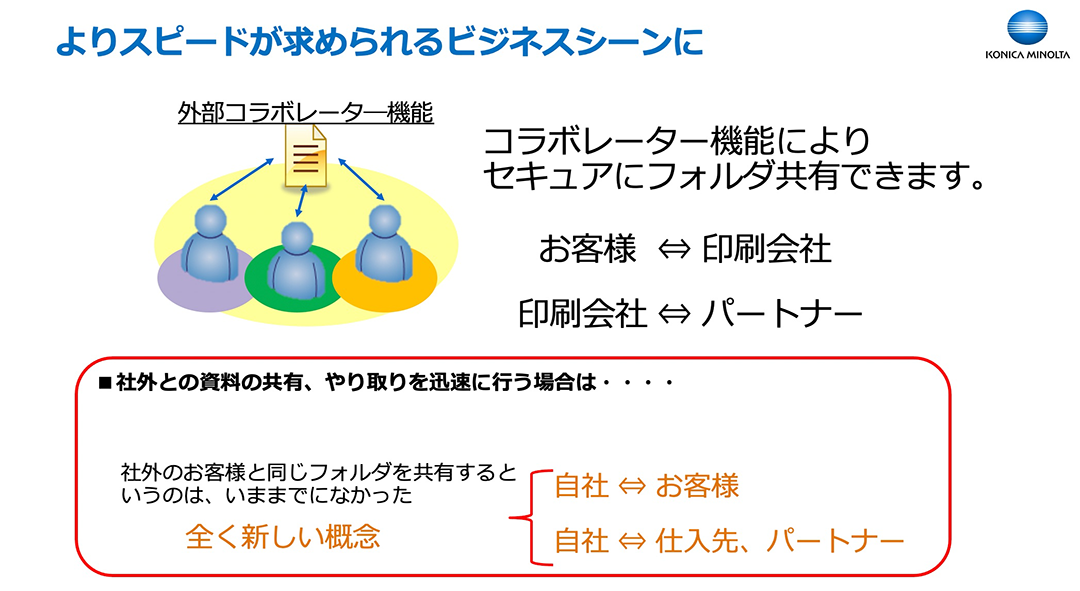 また、コラボレーター機能を利用した社内外関係者との効率的なファイル共有により、業務の生産性をアップします。