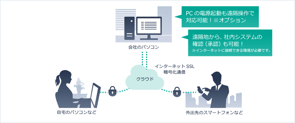 社内PCに作業環境がある場合、自宅や外出先のPCやタブレットなどから会社にあるPCを遠隔操作するリモートデスクトップ環境で、テレワークを実現する方法があります。