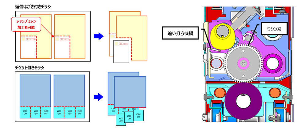 他にも、ミシン目がつけられる位置の拡張やクリース領域の拡張、名刺対応サイズの拡張など、さまざまな機能強化を量産化で実現しています。