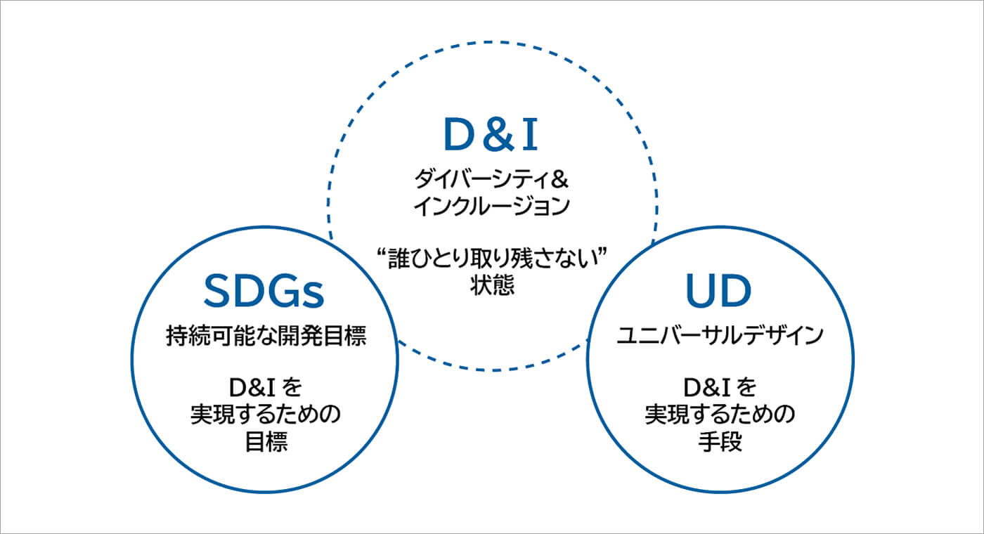 歴史をひもとくと、D&IとUDの源流は密接にかかわっており、SDGsを「D&Iを実現するための目標」、UDを「D&Iを実現するための手段」と位置づけると、いまUDに取り組む意義を理解しやすいのではないでしょうか。