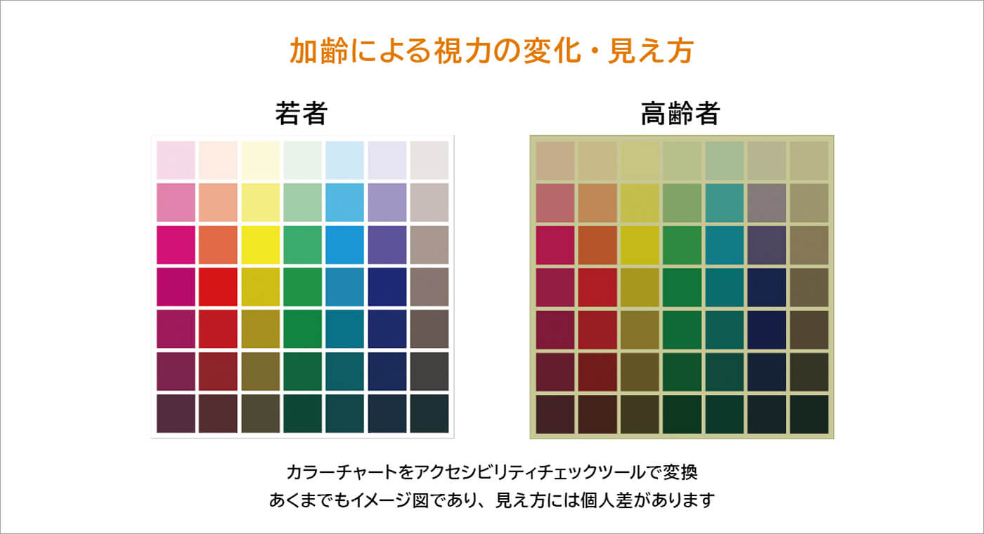 文字サイズ、フォントとならぶ重要な配慮要素は、色の使い方です。日本人男性の20人に1人といわれる赤系と緑系の判別ができない色弱の方ばかりでなく、誰もが加齢により色を見分けにくくなります。