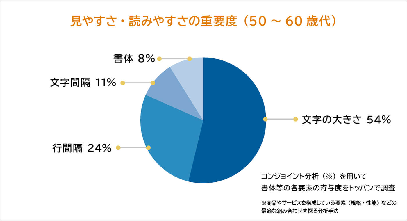 たとえば視力の衰えによる見えにくさへの対応は、年齢を問わず、それを見る環境や身体的なコンディションによる見えづらさにとっても有効です。また、認知能力の低下への対応は、忙しくてじっくり読む余裕がない場合などにも役立ちます。シニアのニーズに応えることは、人の多様性に応えるという観点で汎用性の高い解決策を検討する重要なヒントになるのです。