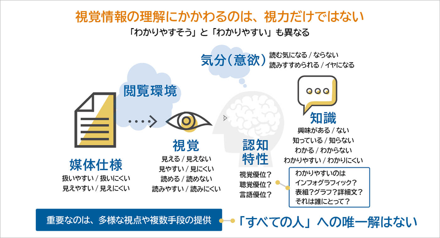 近年、発達障害(神経発達症)が注目されたことにより、認知特性の多様性はすべての人にかかわることがわかってきました。視覚映像優位と聴覚言語優位に大別され、それぞれ視覚情報を認知・理解・記憶するプロセスが異なります。端的にいうと、わかりやすさは人によって異なるということです。デザイン業に就く人は、視覚優位の場合が多いと想像できます。自分と異なる意見を排除しないことが必要です。