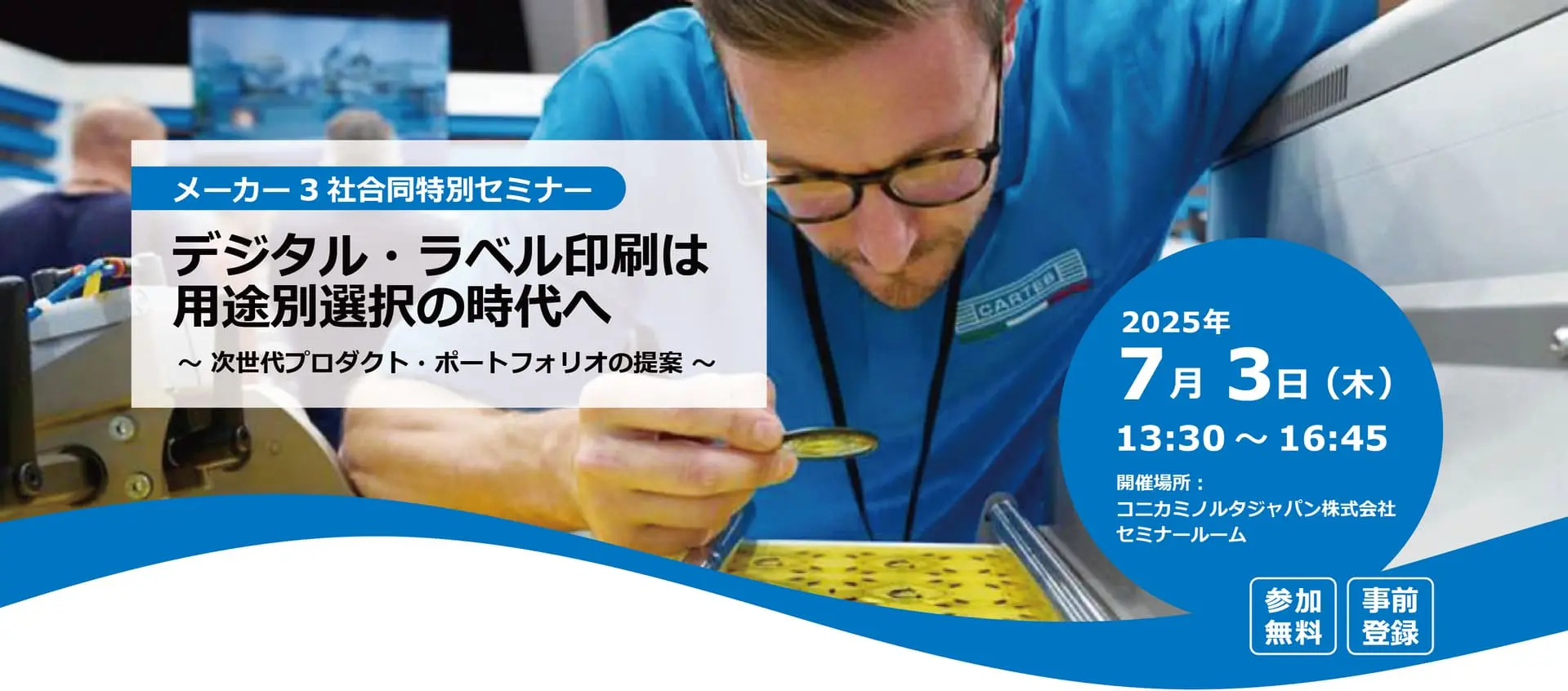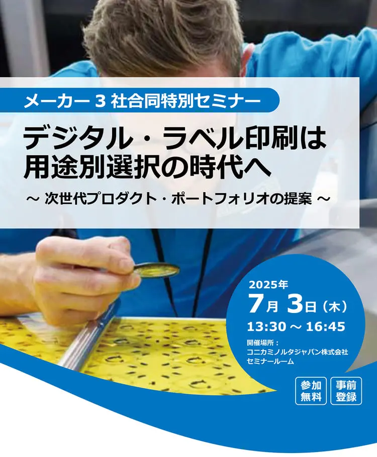 そこで、今回ご案内する特別セミナーでは、個別メーカーが単一商品をPRするのではなく、ラベル・シール分野の先進デジタル3社が合同で登壇。「用途別の最適化」を旗印に、各社製品ポートフォリオを組み合わせ、新たなデジタル印刷の活用法をご提案いたします。