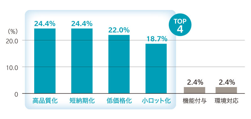 ラベル新聞社が実施したアンケート結果によると、シール・ラベル印刷では小ロット化・低価格化・短納期化・高品質化が最も顧客に求められています。商業印刷市場と同様に、ラベル印刷市場においても「大量に安く」から「必要なモノを欲しい量だけ」という小ロット化が進んでおり、デジタル印刷機向けの案件を獲得していくチャンスでもあります。