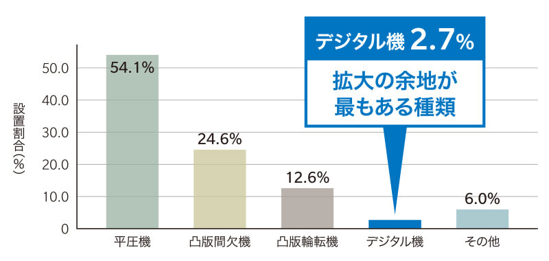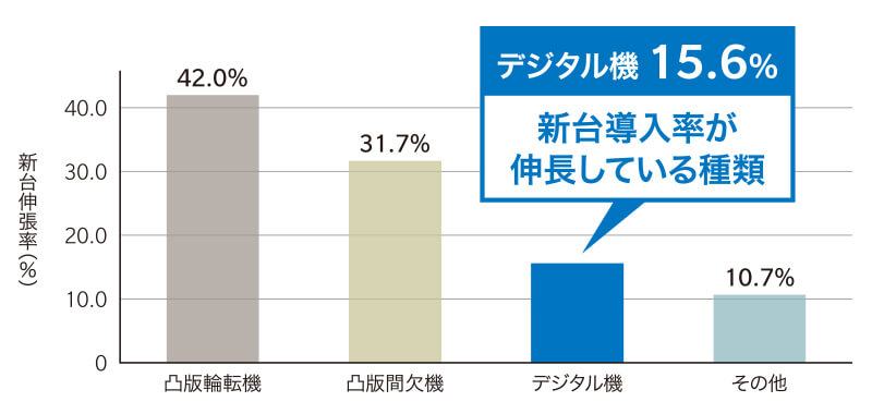 ラベル機の種類別設置状況を見ても、新台設置におけるデジタルラベル機の導入が進んでいます。商業印刷市場でオンデマンド印刷機が普及し一般的に利用されていることと同じように、シール・ラベル印刷においても今後急速にデジタル化が進むことが予測されます。