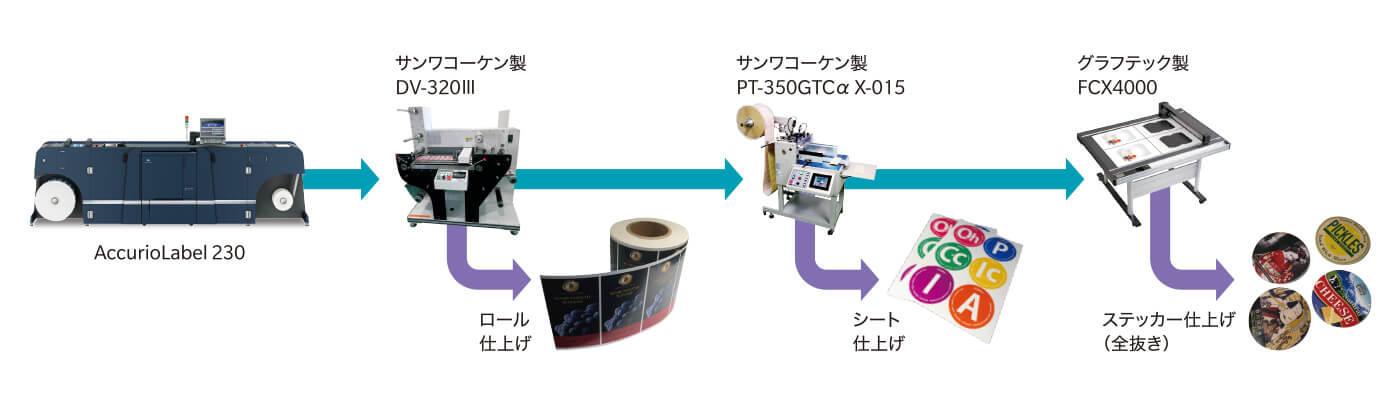 印刷から後加工までフルデジタルでラベル生産できる様々なラインナップがあります。こちらは一例となりますので、納品形態や製造されるラベルの種類など、ヒアリングを通じて最適な組み合わせをご提案させていただきます。