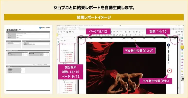 本印刷前に基準画像を1部登録。本生産時は見本と比較して不良がないかを判定し、画像異常をリアルタイムで自動検出します。不良検知時には、補正や再印刷まで自動で実行します。印刷ジョブ終了後には印刷結果をPDFのレポートで確認可能です。