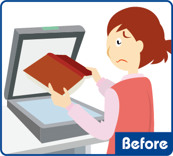 原稿を持ち上げて下向きにセット。複数ページをスキャンする場合には、その都度セットしなければなりません。ページ数が多く重たい書籍などは、時間も掛かり大変な作業となります。