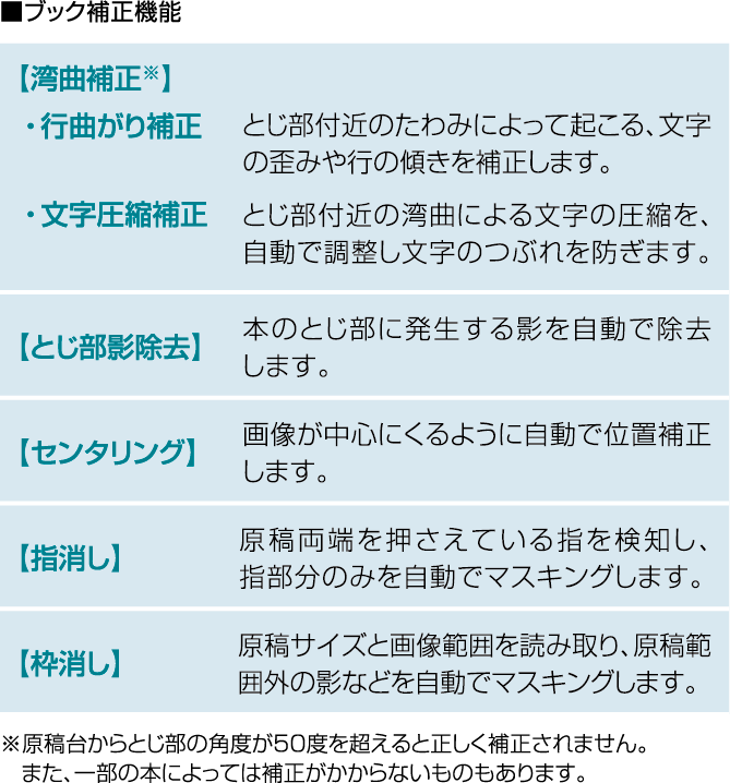 ブック原稿特有の湾曲やとじ部の文字組みなどを自動で補正するほか、とじ部影除去や枠消し、指消し機能等のデジタル補正機能を搭載。さまざまな原稿を自動的に美しく再現します。