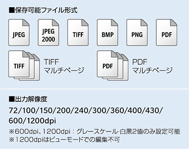 多くの保存ファイル形式と幅広い出力解像度に対応していますので、用途に合わせて活用シーンが広がります。