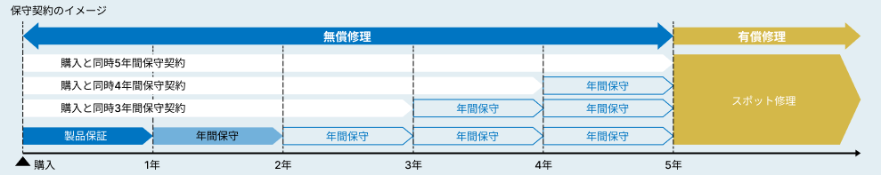 保守契約には、保証期間終了後1年単位の年間契約と、購入と同時に複数年で契約いただける複数年契約がございます。
