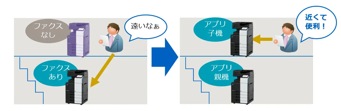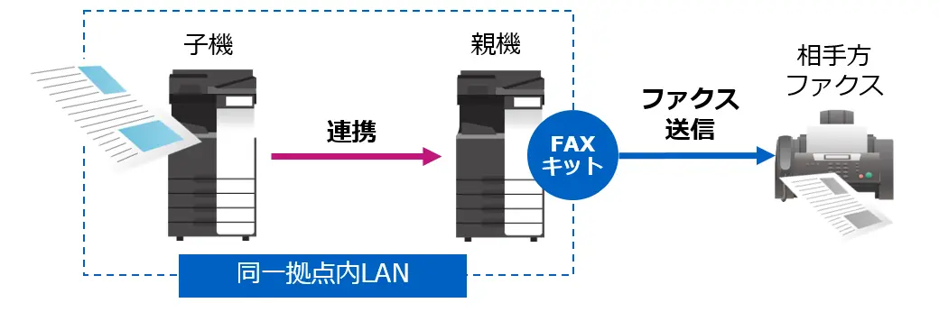 子機は、親機と同一拠点内LANに接続されていればどこにでも設置可能です。複合機の置き場所をファクス回線の位置に縛られないので、今までファクス機を置けなかった場所にもファクス送信機能を増やせます。