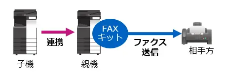 「bizhub ファクス連携送信」は、 FAXキットを搭載していない複合機(子機)からFAXキットを搭載している複合機(親機)を経由してファクスを送信できる複合機専用アプリケーションです。
