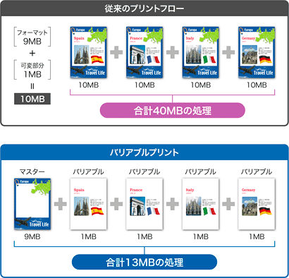 DMやチラシなどの印刷物ではマスターとなるフォーマットデータと可変部分であるバリアブルデータで構成されています。バリアブルプリントでは、固定画像と可変部分を常にRIP処理する場合の処理容量肥大化を抑え、コントローラの処理容量を最小限に抑え高速処理を実現することが可能です。
