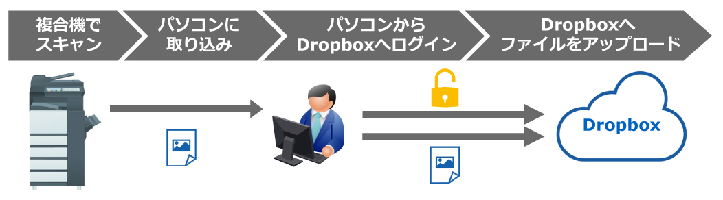 これまで紙文書をスキャンしてDropboxで共有する際は、パソコンでスキャンしたデータを取り込み、Dropboxへアップロードする作業を行う必要がありました。
