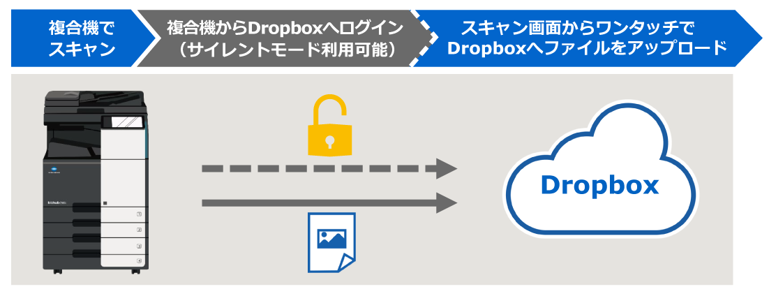 複合機でユーザー認証を行っている場合、Dropboxへサイレントモードでログイン可能なため、認証にかかる手間を大幅に削減します。