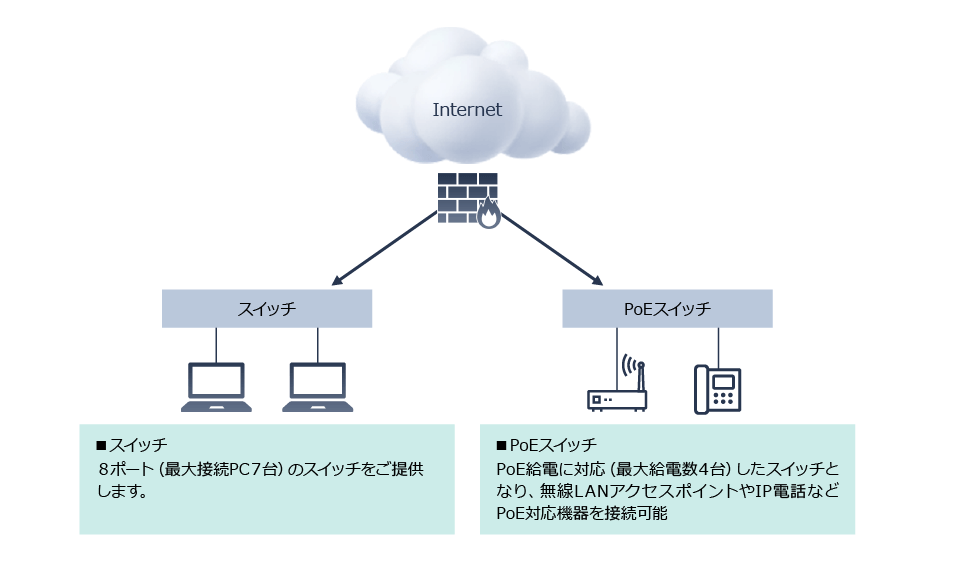 無線LANやIP電話がAC電源不要で利用可能となるPoE給電機能付きのスイッチもご提供しています。