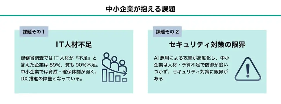 IT人材不足:専門知識を持つ人材を雇うのは難しいため、外部サービスで補うのが現実的。