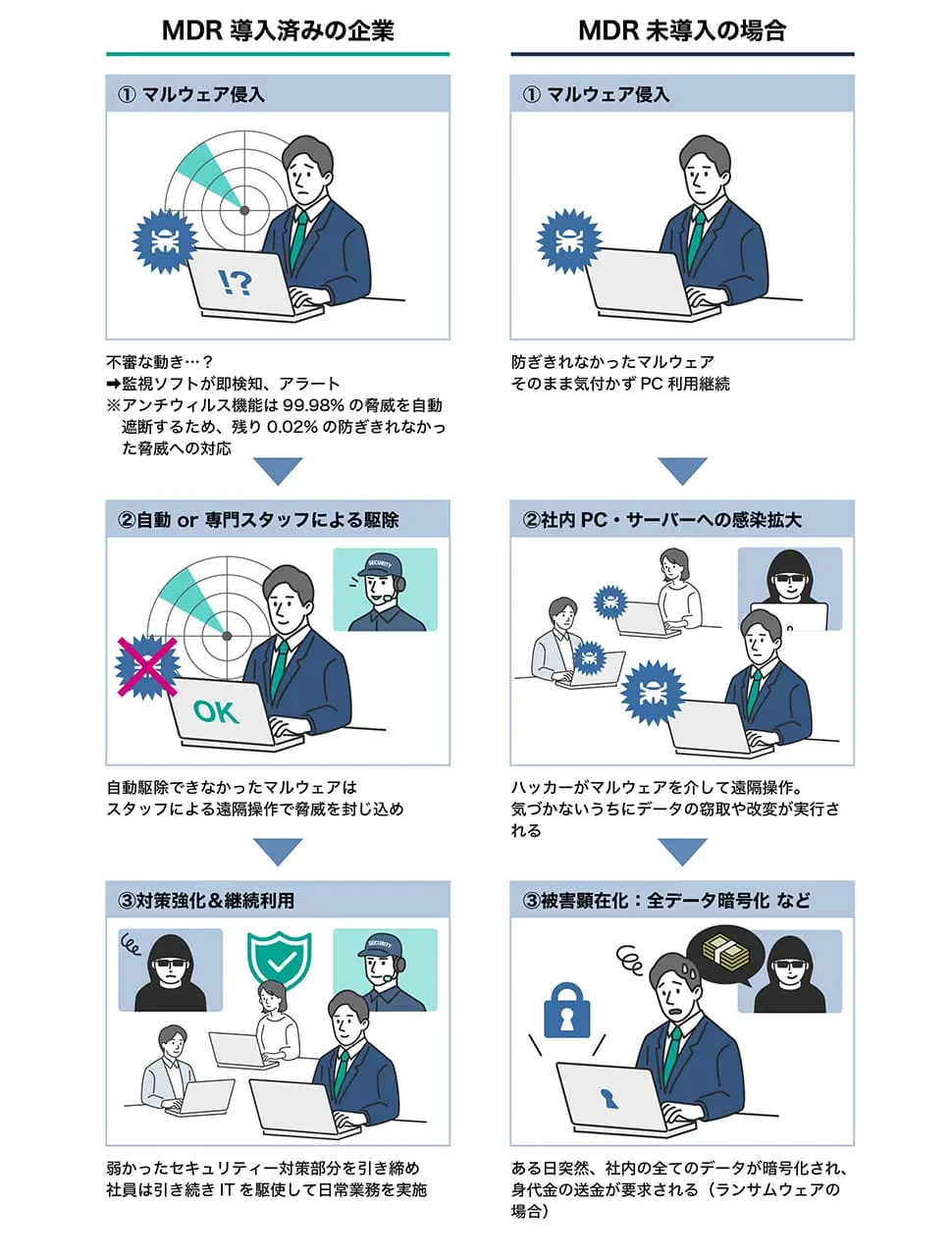 MDR:EDRの機能に加え、専門チームがリアルタイムで脅威を分析し、封じ込めや復旧まで支援します。IT担当者がいない企業でも安心です。