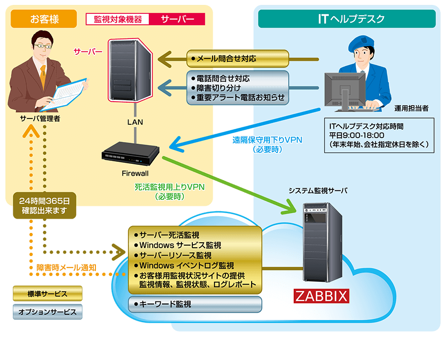 オプションで、ITヘルプデスクによるリモートでの障害切り分けおよび電話によるお知らせも行います。