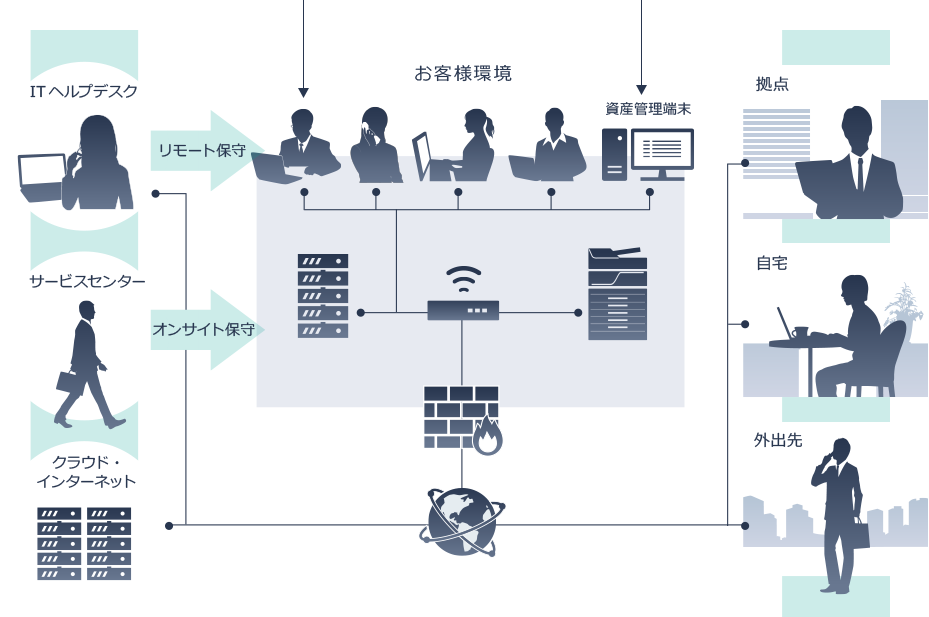- セキュリティー、データのバックアップ、IT資産管理などのサービスと組み合わせて、 IT機器の困りごとをワンストップで解決