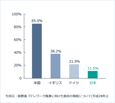 テレワークの導入効果は高いと認知されているにも係わらず、諸外国と比べても日本の普及率はまだまだ低い状況です。
