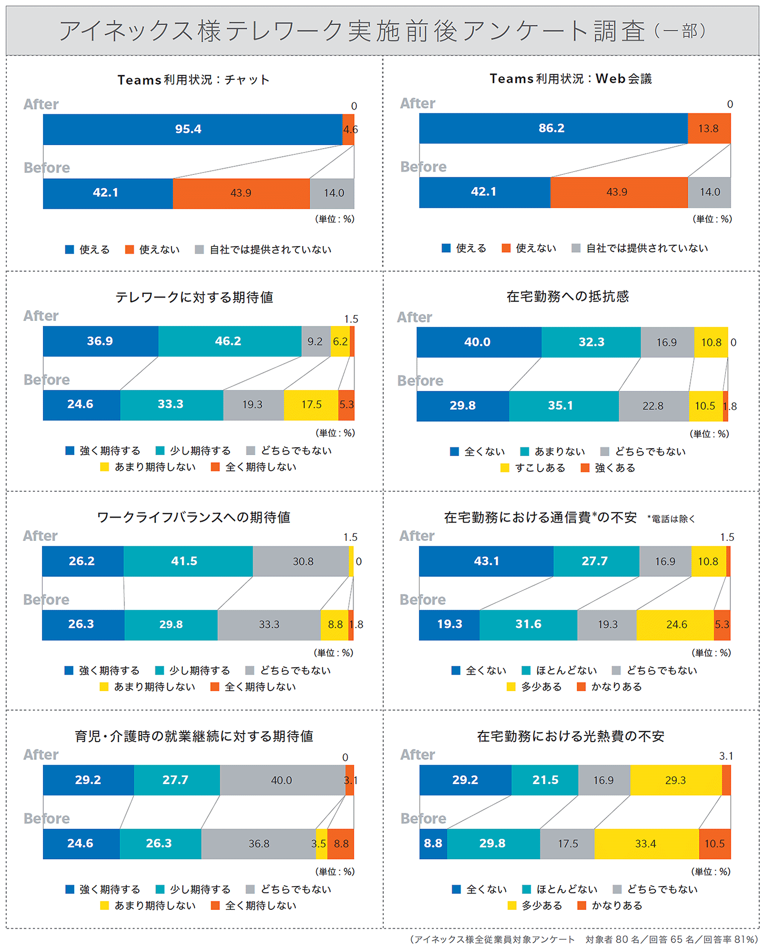 また、全社一丸となった体制を認識してもらうため、テレワーク実施前と後にアンケートを実施し、全社員から課題を募りました。「匿名で行いましたが、結構正直な意見が集まって良かったと思います。例えば、テレワークでは押印業務に支障が出るという意見も出ましたが、管理者を替えたり、担当者を増員したり、柔軟に対応することができました。」社員にとっても、協議により解決策が見出せるという安心感があったようです。