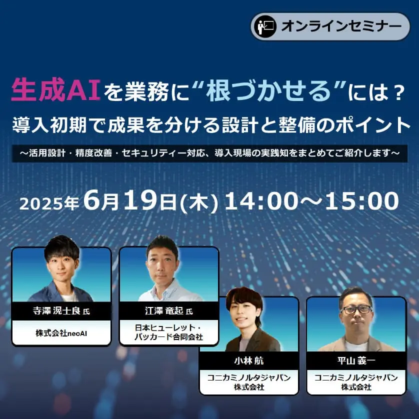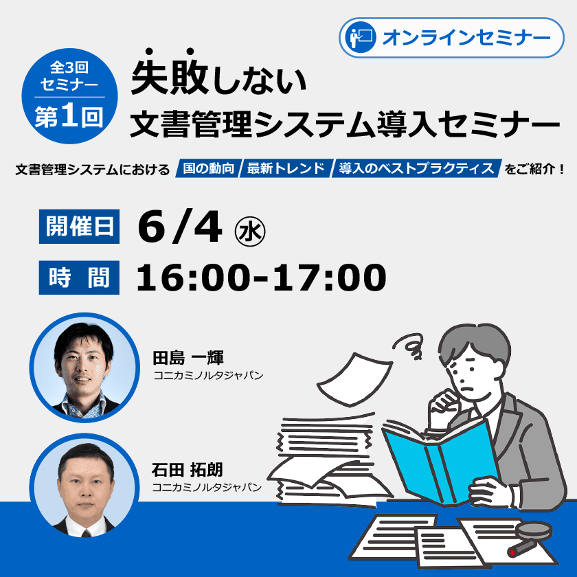 コニカミノルタジャパンは、2013年よりさまざまな「働き方改革」に取り組み、失敗と成功を通して「いいじかん」を実現するノウハウを蓄積しつづけています。皆さまにも「いいじかん」を実現してもらうため、そこで得たさまざまなノウハウと、お客様事例を交えて紹介するセミナーを開催しております。「人財不足を解消したい」、「溢れた紙文書をなんとかしたい」、「業務フローを効率化したい」など、社内の課題を解決したい方にもおすすめです。