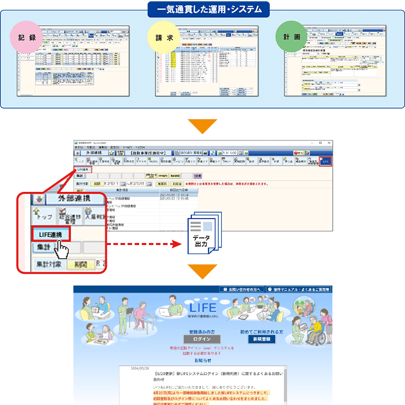 「LIFE」にも完全対応。介護記録から請求業務までを一気通貫で行うことができるシステムで業務効率化・生産性向上が図れます。