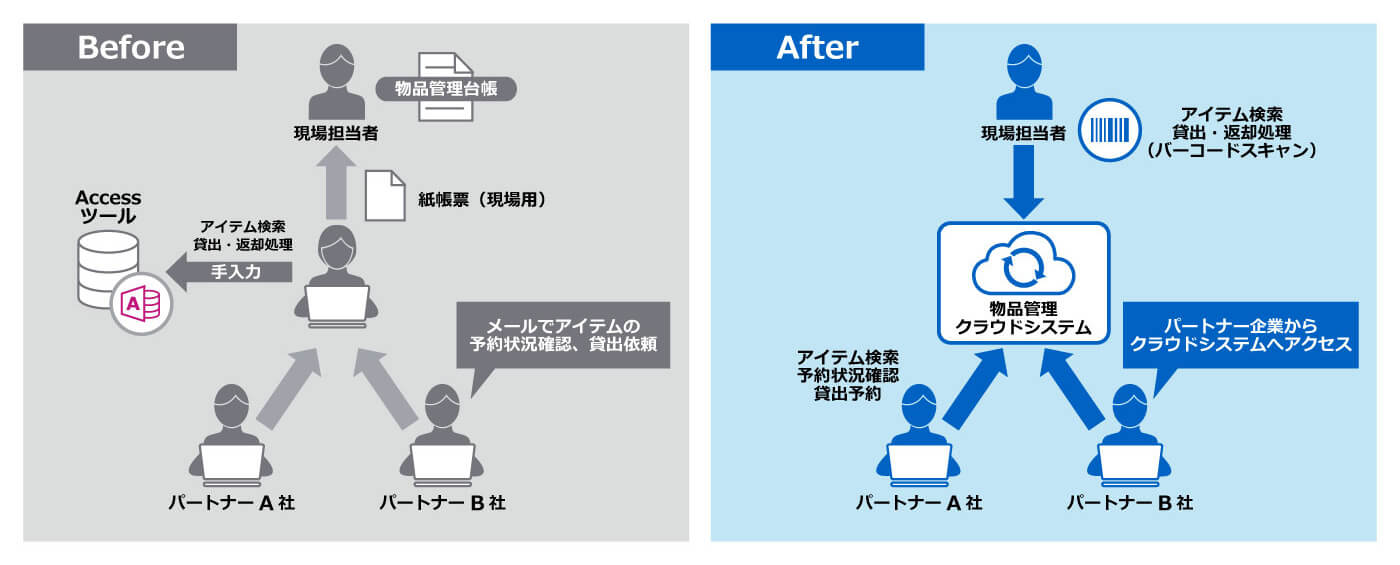 - 社内の備品の貸出管理は依頼者からのメールや紙書きで受け付けた管理者がデータベースへの手入力で管理しており手間がかかっている