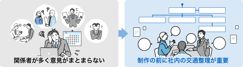 そのためプロジェクトを検討する際には、着手する前に社内の交通整理と進め方の手順を明確にしておくことが重要になります。Webサイトをリニューアルする際には多くの関係者を巻き込む必要がありますが、多くの関係者がいる分、さまざまな意見も出てくるでしょう。