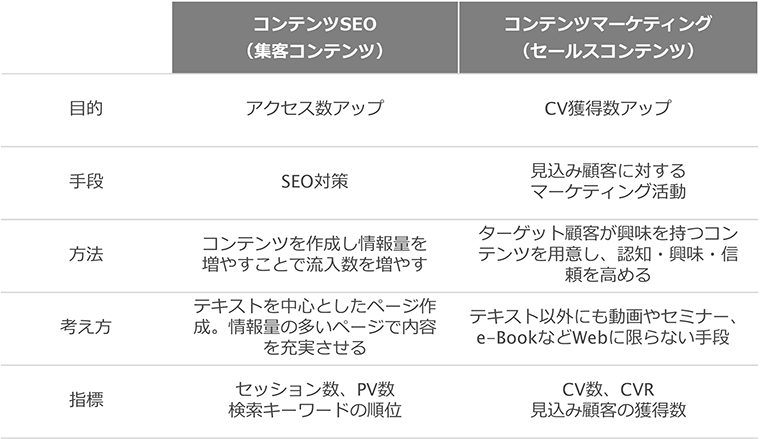 コンテンツSEOはアクセス数アップ、すなわちWebサイトへの集客を目的とするものですが、コンテンツマーケティングはCV獲得数アップ、すなわちWebサイト訪問者にコンバージョンに繋がる具体的なアクションを促すためのものです。