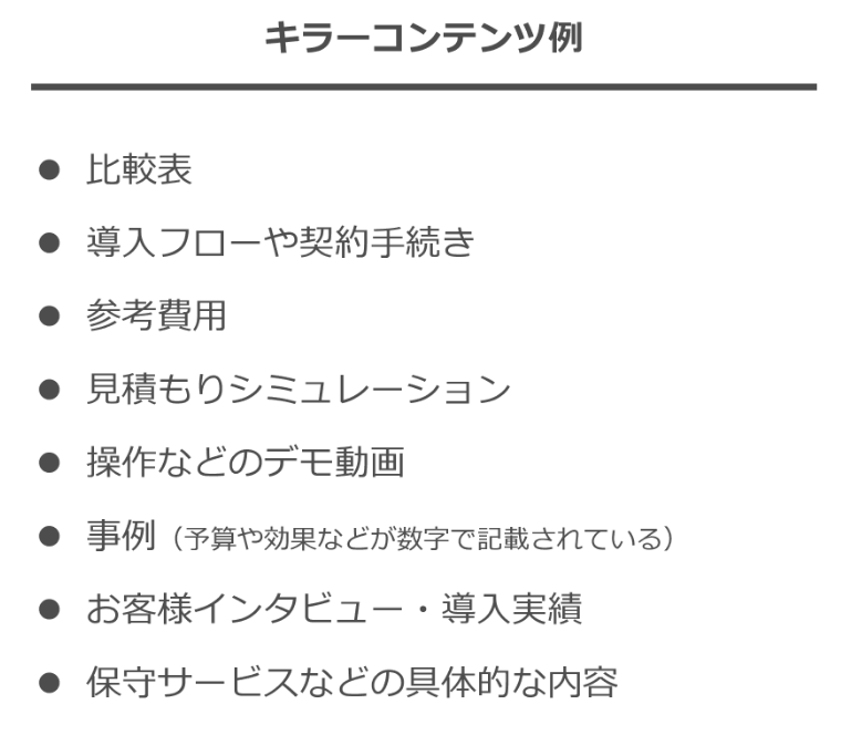 例えば、見積りシミュレーションや導入フロー、操作のデモ画面などは、検討が進んでいる顧客、購買行動まであと一歩という顧客が知りたい情報なので、購買の最後の後押しにつながります。