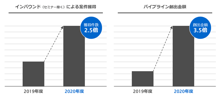 試行錯誤しながらさまざまな施策を実行したことで、Webマーケティング活動を本格稼働させる前と後で、Webマーケティングをきっかけに獲得した案件数やパイプラインの創出金額を2.5~3.5倍に成長させることができました。