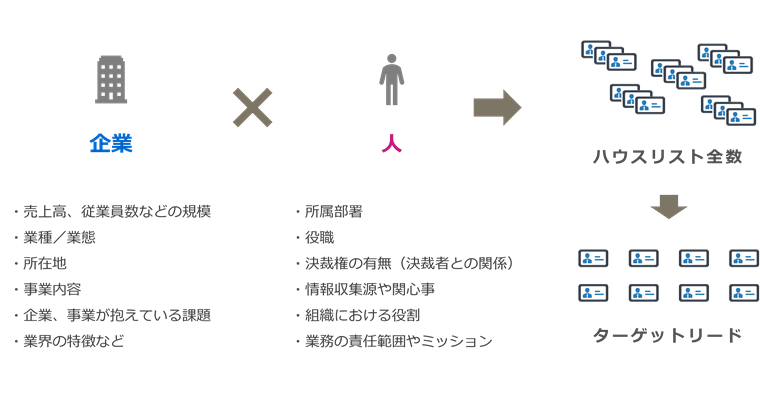 もし、ターゲットがあいまいなままリードが足りないと悩んでいるのであれば、「企業」「人」で条件を明確にしたうえで、ハウスリストを確認し、ターゲットリードを確定することをおすすめします。