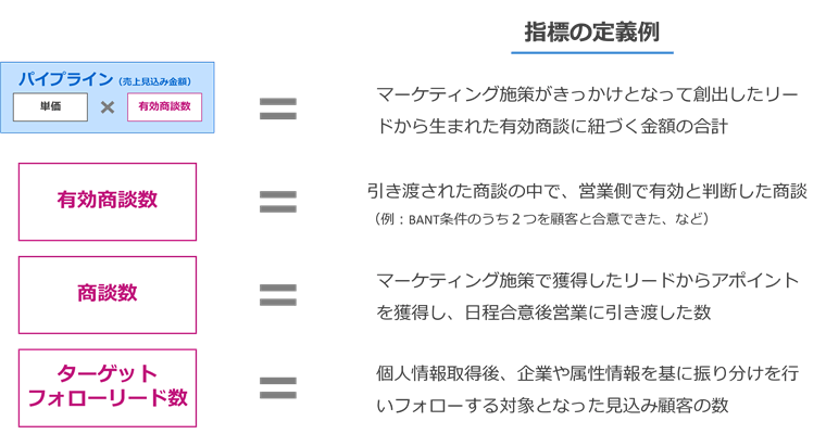 「リード数〇〇名」「有効商談数〇〇件」というように目標とするKGI・KPIを宣言するには、各指標の定義を明確にしておくことがとても重要です。マーケティングだけで決められない指標は、関係者で合意を取りながら、定義を明確にしておきます。