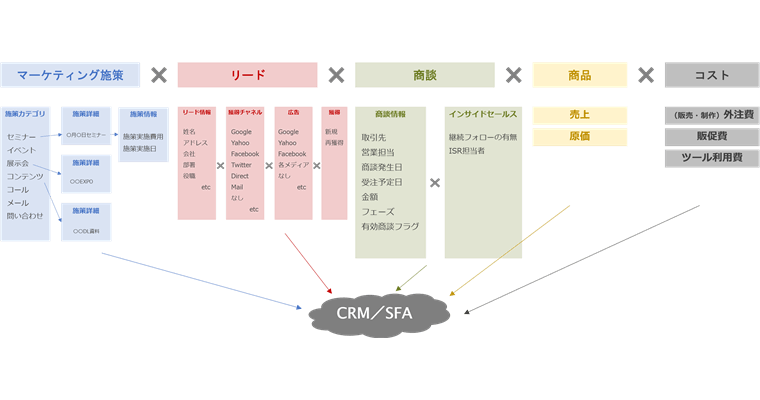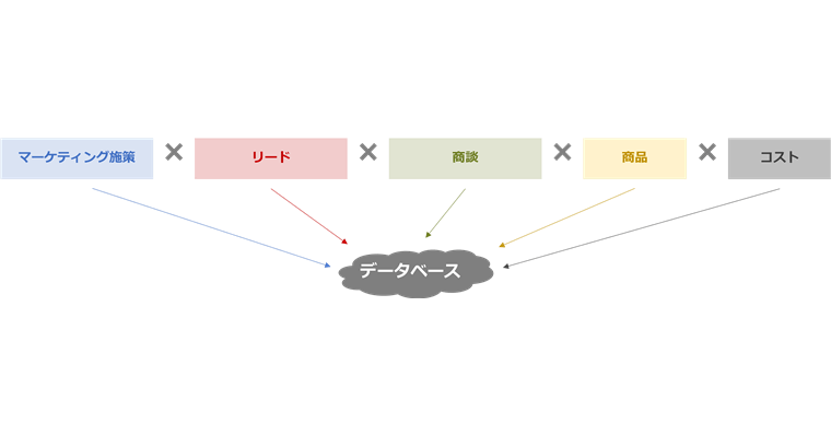具体的には、「マーケティング施策」「リード」「商談」「商品」「コスト」それぞれのデータを集め、これらを紐づけるためのデータベースが必要です。