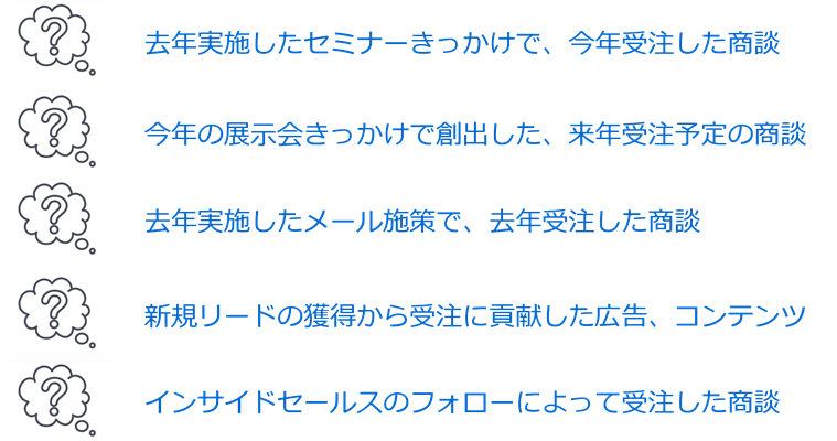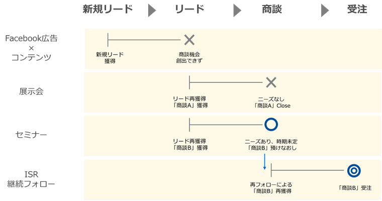 具体例を1つ挙げると、「Facebook広告でコンテンツダウンロード施策を実行したところ、あるリードを獲得したが、その時点ではお客様のニーズがなく商談はCloseに。ただし、その後、同じお客様からセミナーの申し込みがあり、インサイドセールスが継続的なフォローをしたおかげで最終的に受注につながった」というケースがあったとします。