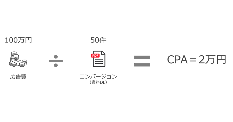 ここで大事なのがCPAです。CPA(Cost per Action:顧客獲得単価)は、資料のダウンロードやセミナー申し込み、問い合わせなどのコンバージョンを1回獲得した際の単価のこと。主に、広告出稿費用からどれくらいコンバージョンを獲得できたかを測るために用います。