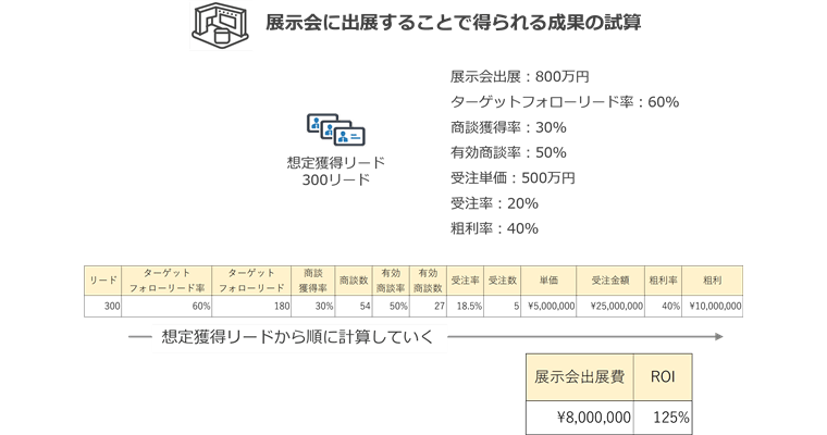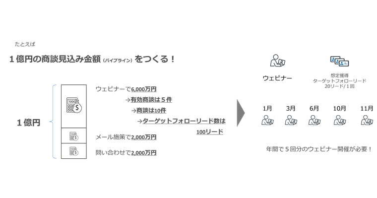 成果目標から逆算して、必要な有効商談数や商談数などを試算していく方法もあります。こちらはリードジェネレーション施策全体の大枠を考える際に役立ちます。