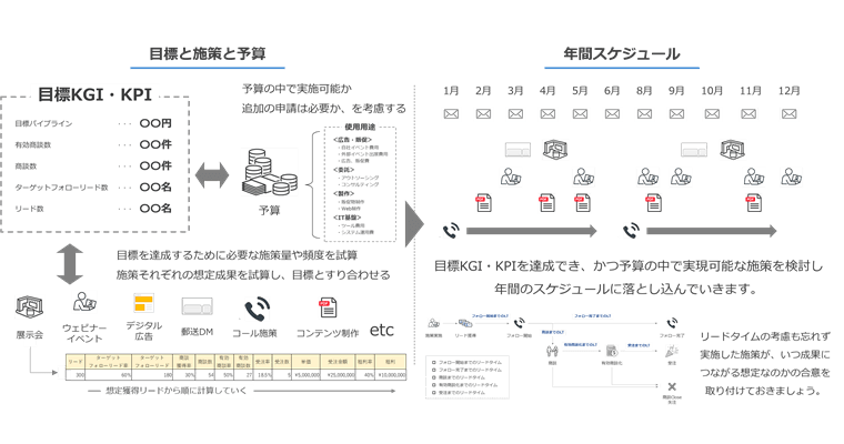 目標KGI・KPIを定め、予算内で実現できるかどうか、想定する成果を出せるかどうかを試算しながら実行すべき施策を決め、リードタイムを考慮しつつ年間計画を立てます。
