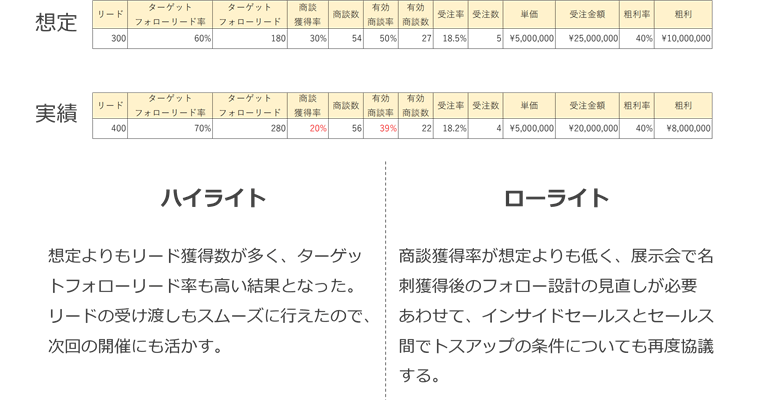 ポイントは「ハイライト(想定よりも良い結果)とローライト(想定よりも悪い結果)をまとめ、次の施策に活かす」ということです。