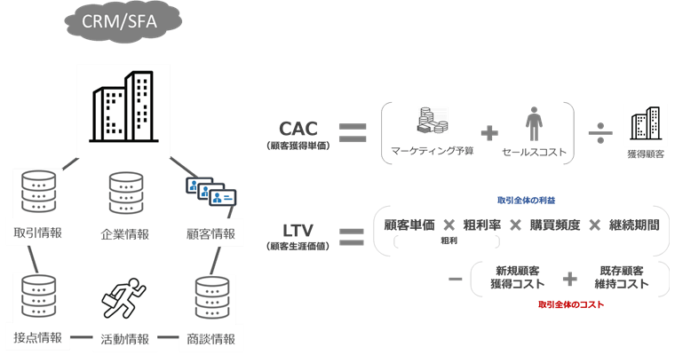 蓄積された情報資産から新規顧獲得コスト(CAC)や顧客生涯価値(LTV)を算出し、マーケティング施策に掛けられるコストや創出した成果・収益を分析します。