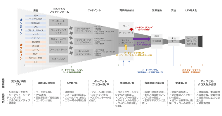 マーケティングには「リード創出・商談機会獲得・商談の有効化・受注・LTV最大化」といったポイントがあります。