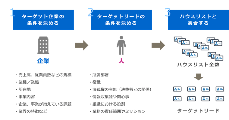 ターゲットとする企業やリードの条件を明確にし、自社が保有するハウスリストと突合することで自社が求めているリードの有無を確認します。
