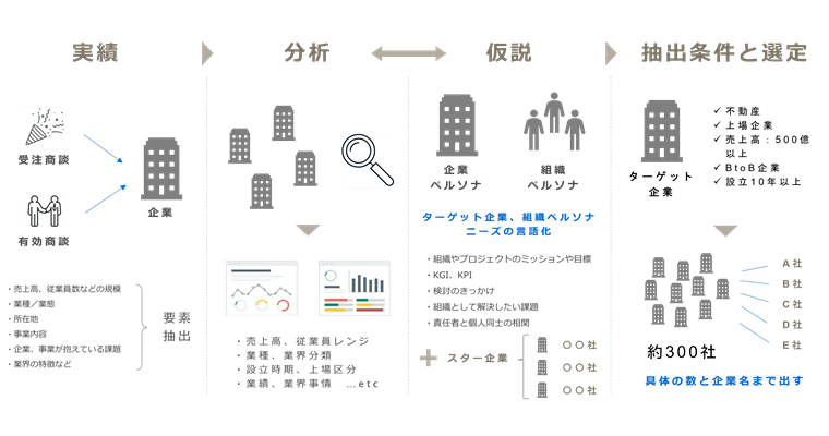 ターゲット企業の条件を決めるには、これまでの実績から分析し、仮説を立てて、抽出条件と選定を行います。まだ実績がない場合でも、何らかのデータから仮説を立て、抽出条件と選定を行うことに変わりはありません。