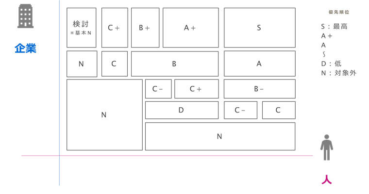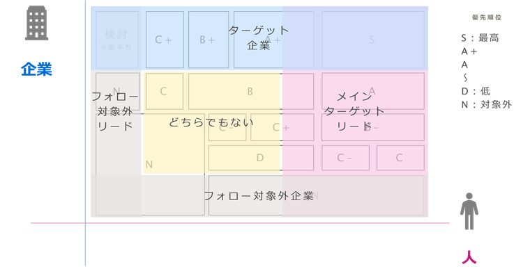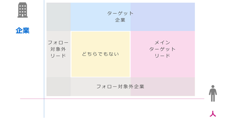 もちろん、ターゲット企業の条件を緩めつつ、フォロー対象外を明確にする、条件を厳しくして特定の顧客のみを追う等のマーケティング戦略で、どちらでもない企業・リードをなくしておくという方法もありえますが、一般的には「どちらでもない」領域が存在することを理解しておく必要があります。