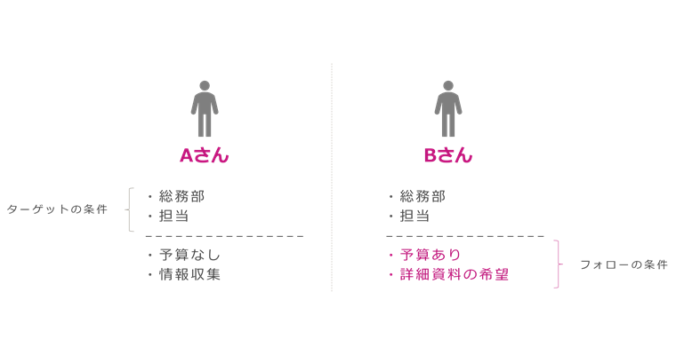 ターゲットリードかどうかを「その時の属性情報」のみでシンプルに判断したほうが良いのは、フォローの条件は顧客のフェーズ(想像や検知、データなど)と自社の基準・意思で決まるからです。